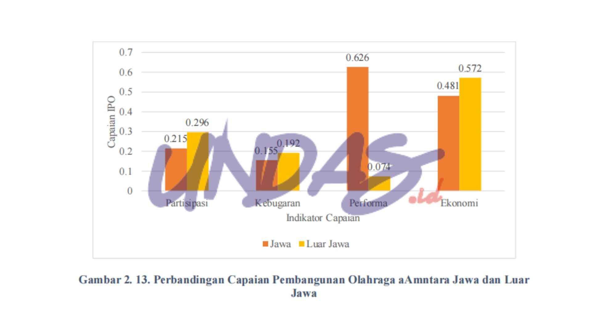 Sementara itu, untuk capaian indikator yang lain seperti partisipasi, kebugaran jasmani, dan belanja olahraga, daerah di luar Jawa justru lebih tinggi meski perbedaannya tidak signifikan. Partisipasi dan kebugaran jasmani lebih terkait dengan gaya hidup aktif yang melekat pada masyarakat menengah ke bawah.